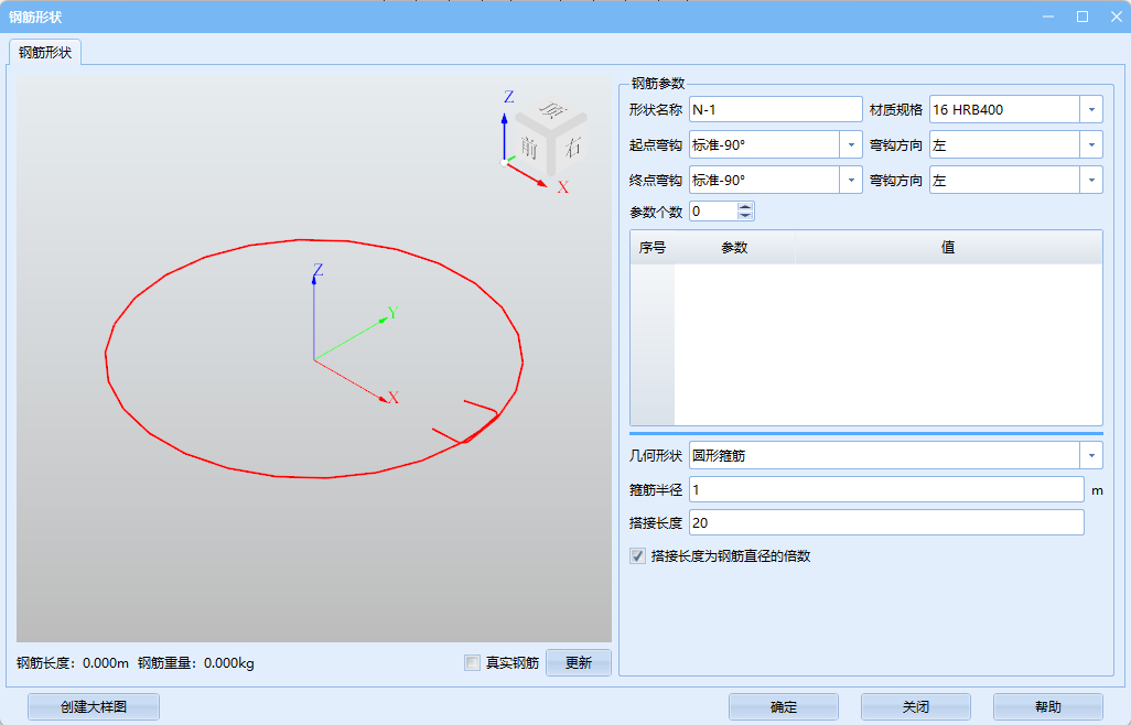 对于圆形箍筋,控制参数为半径与搭接长度,勾选搭接长度为钢筋直径倍数时,实际值为输入值xD,不勾选时单位为m。