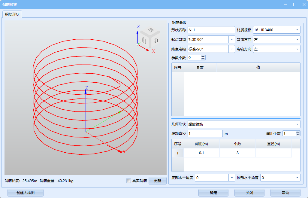 对于螺旋筋,需要给定底部直径、每一段的螺距、个数、直径以及顶部和底部螺旋圈数。