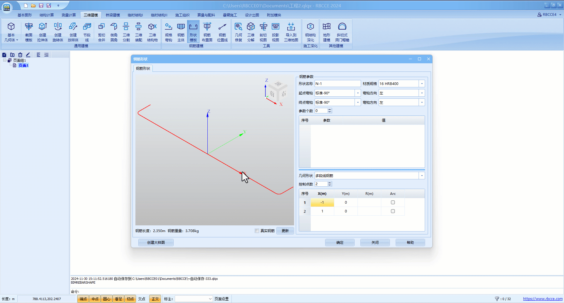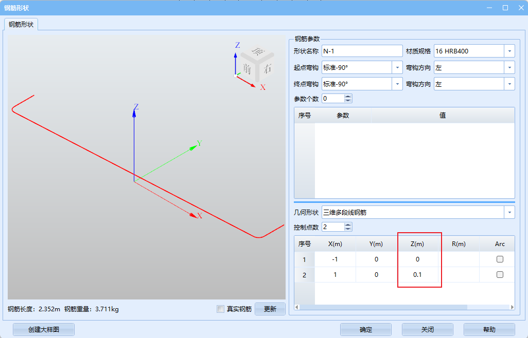 将几何形状修改为三维多段线钢筋,大部分参数与多段线钢筋一致,区别在于控制点处多了Z坐标,三维多段线钢筋在桥塔钢筋上较为常见,输入时注意即可。