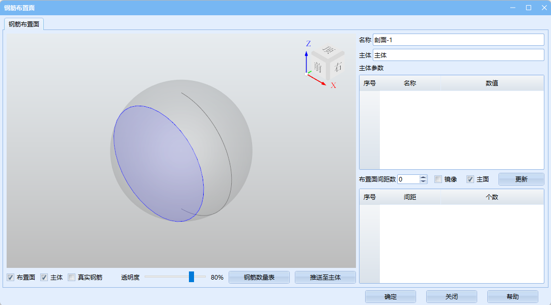 - 布置面、主体、真实钢筋、透明度(左下角):控制显示;