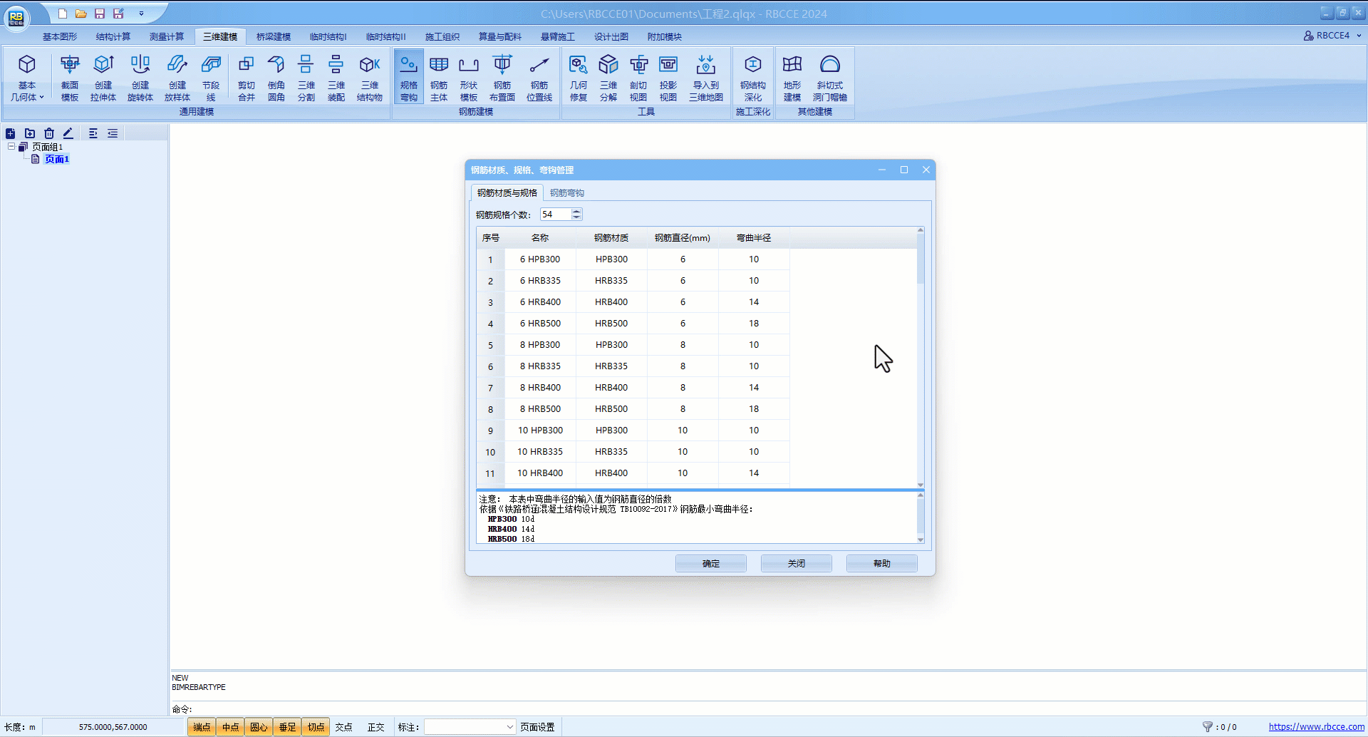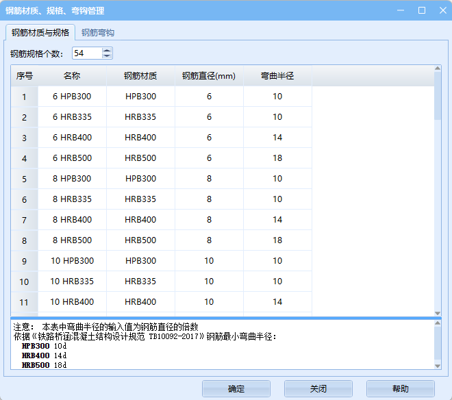 该表默认依据《铁路桥涵混凝土结构设计规范 TB10092-2017》输入,绘制所得到的钢筋长度与设计资料不一致,为钢筋下料长度,如需要与设计对比,将对应钢筋的弯曲半径修改为0即可,如不修改默认数据,可添加数据并进行修改,这里以HRB400 20钢筋为例,操作如下,注意修改名称即可。
