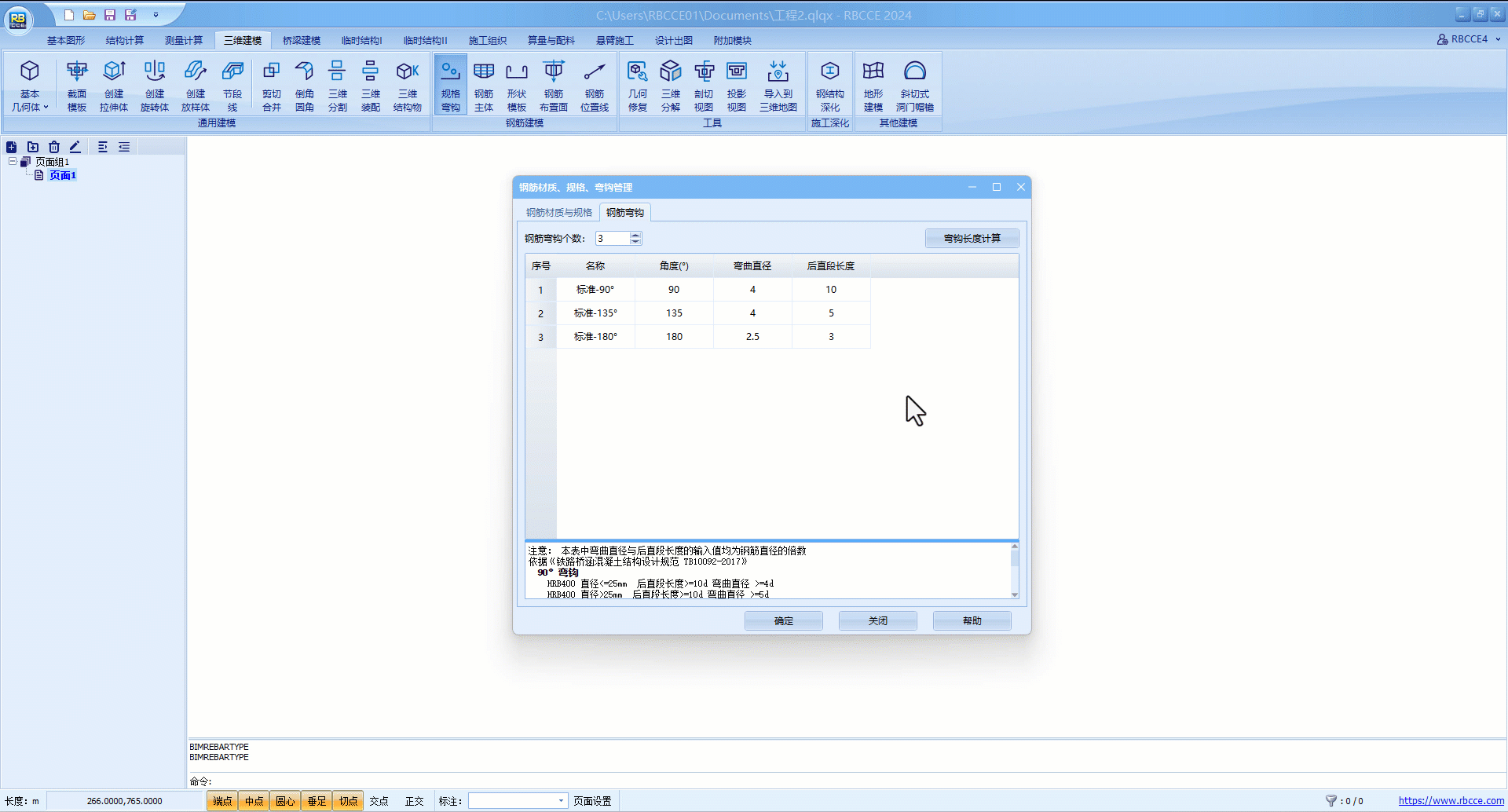 弯钩长度默认为规范最小值,部分情况下设计可能会有所更改,需要检查设计所提供的弯钩长度是否与RBCCE软件一致,不一致需修改弯曲直径与后直段长度,也可添加项进行修改,参考钢筋规格即可。