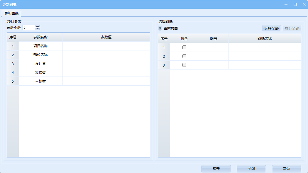 左侧为参数名称与其相对应的目标值,右侧为需要修改的图纸。在左侧填写对应的参数值,在右侧勾选图纸,完成后点击确定按钮,完成操作。