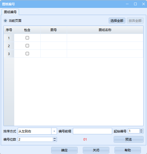 勾选需要编号的图纸,选择排序方式,输入前缀、起始编号、编号位数参数,点击预览可查看效果,无误后点击确定按钮,完成操作。