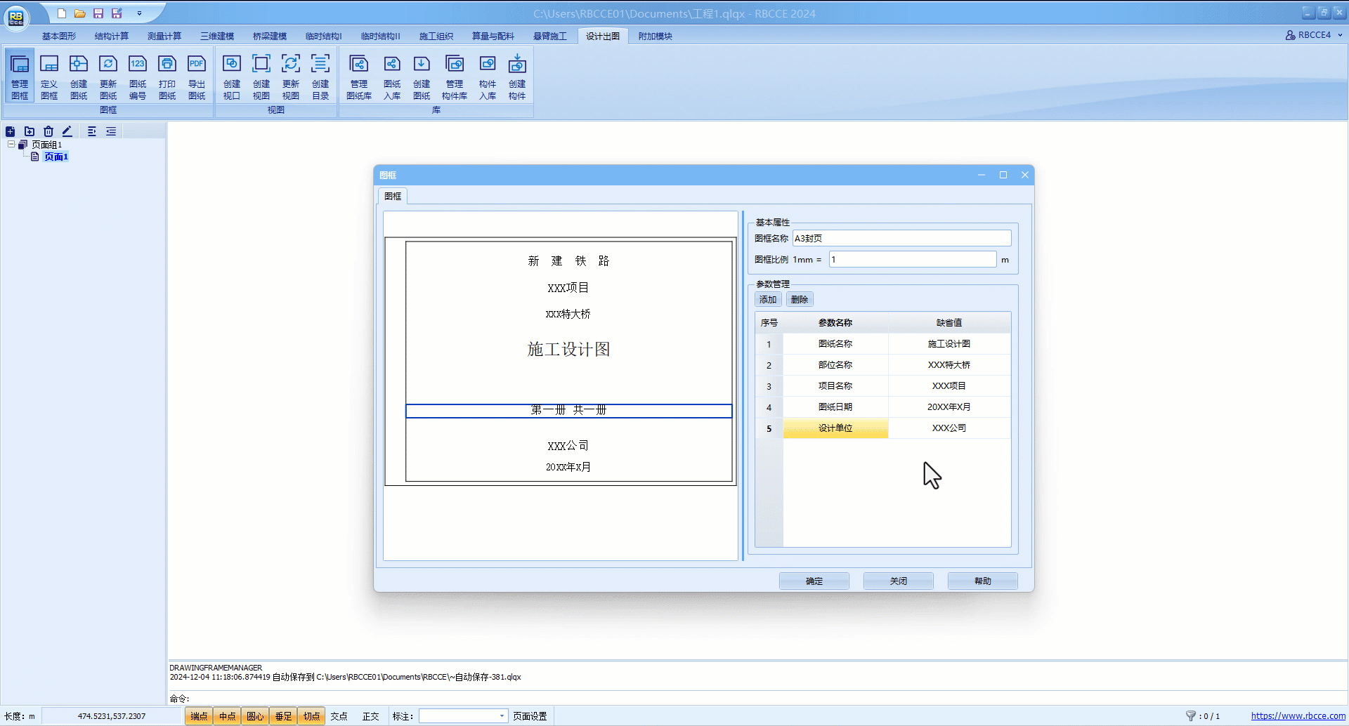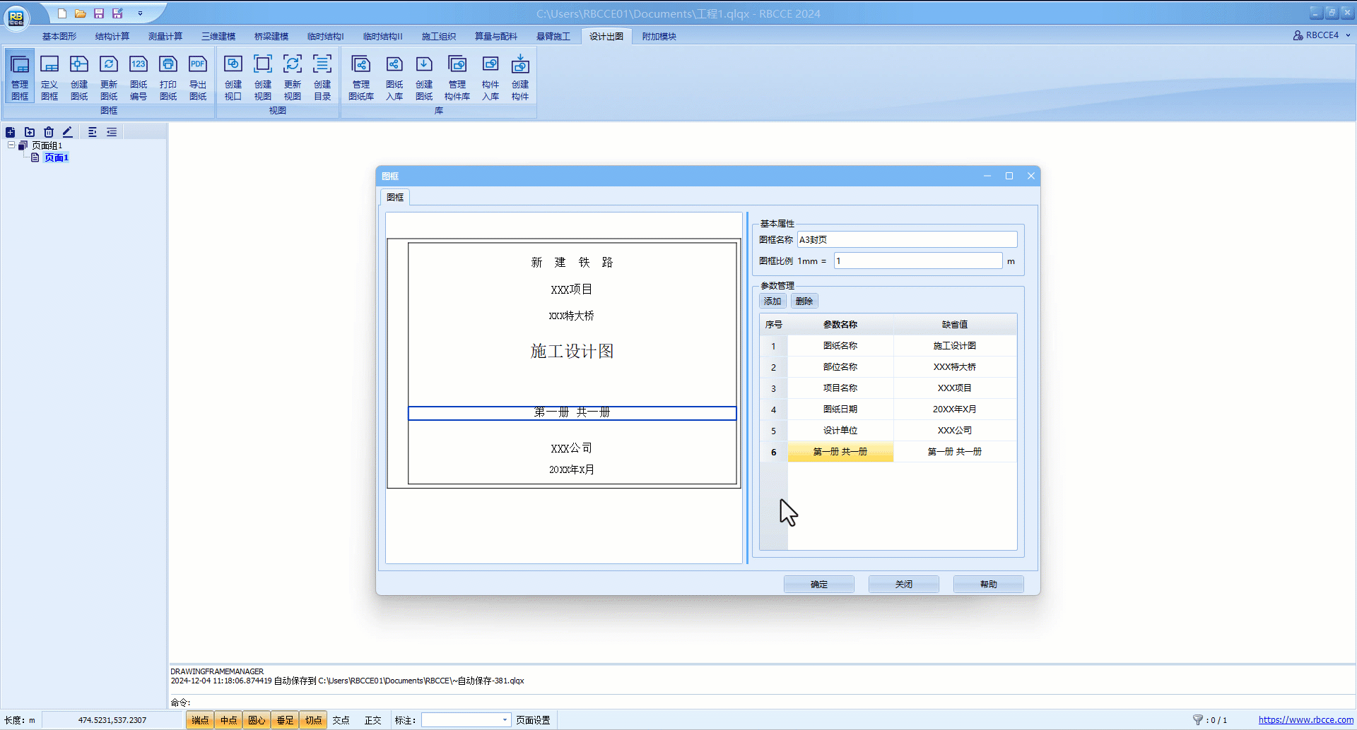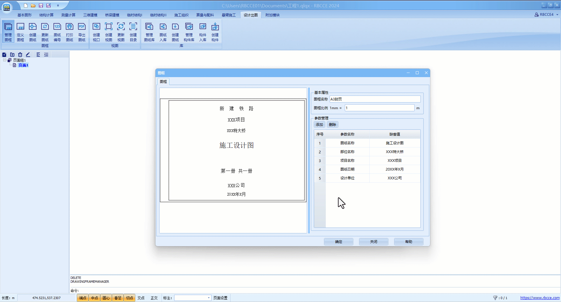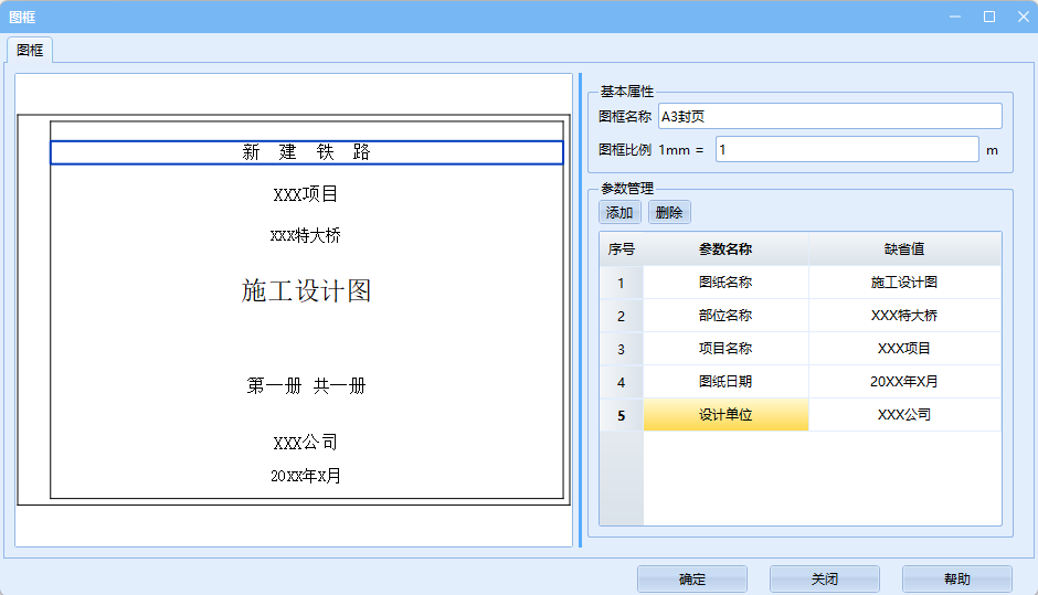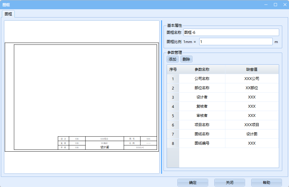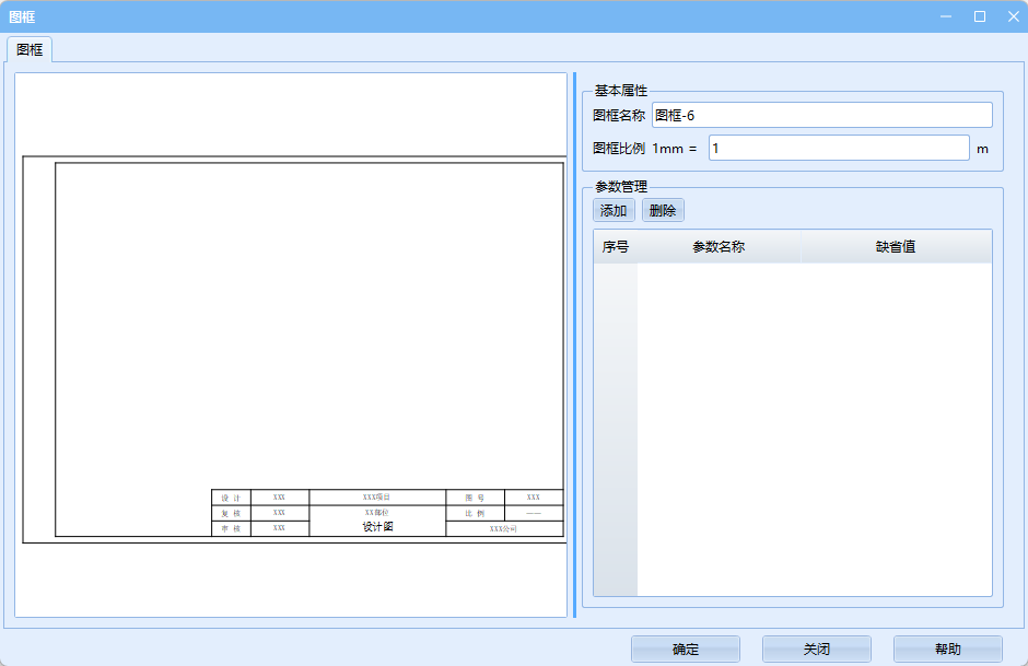 可修改当前图框名称及比例,也可对参数进行添加、删除或修改默认值。