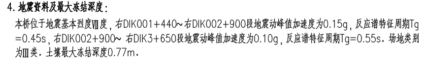 地震加速度。在通图/专图中,有时会依据地震加速度来对桥墩进行区分,处于不同地震加速度下的桥墩,其尺寸会有所区别。地震加速度可在设计说明中找到。