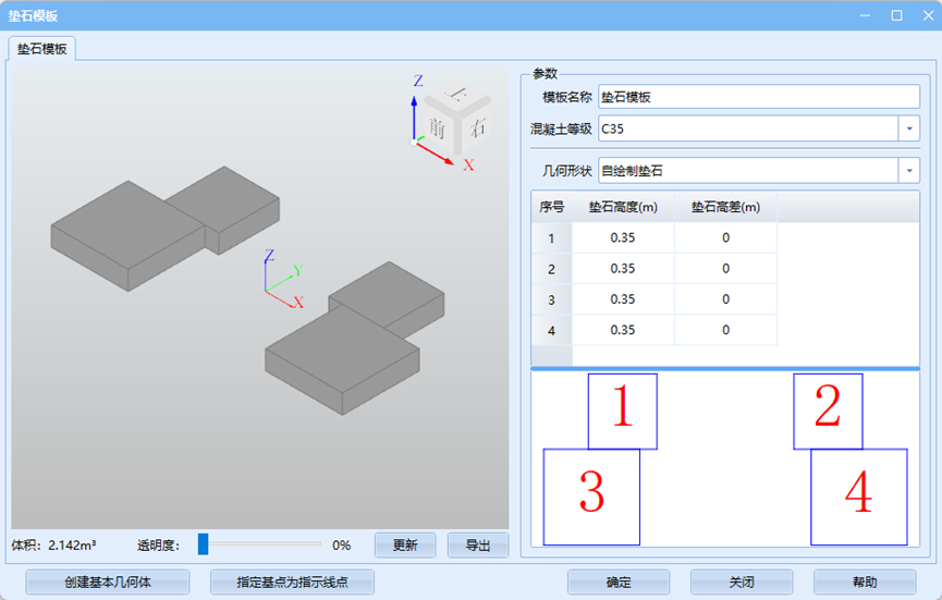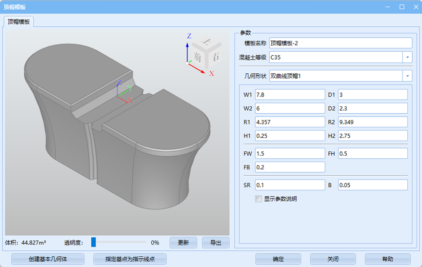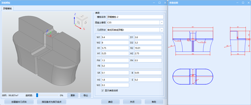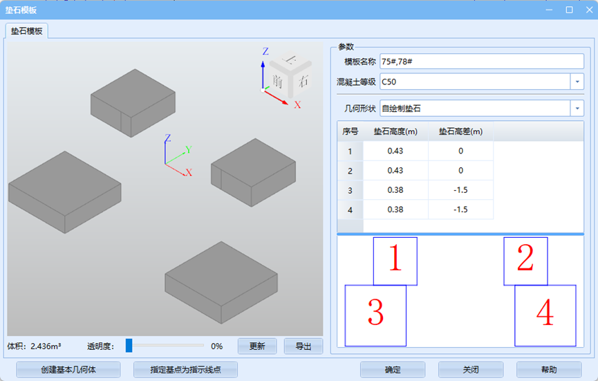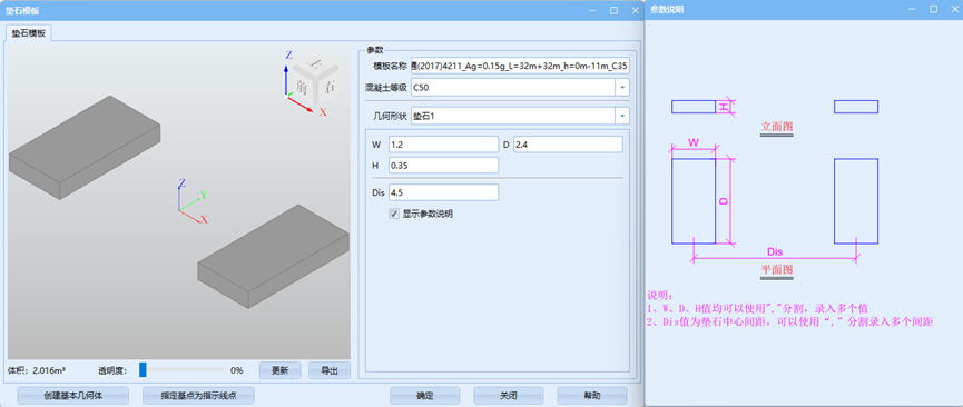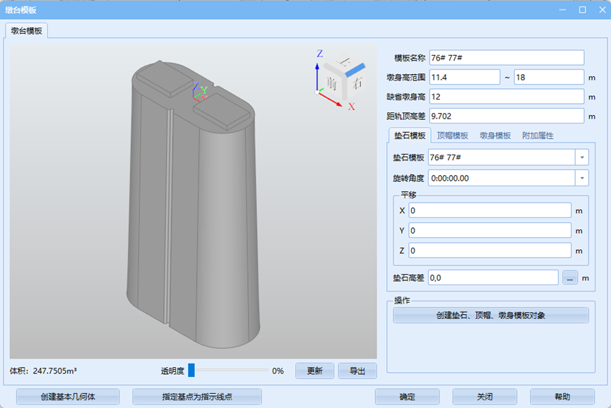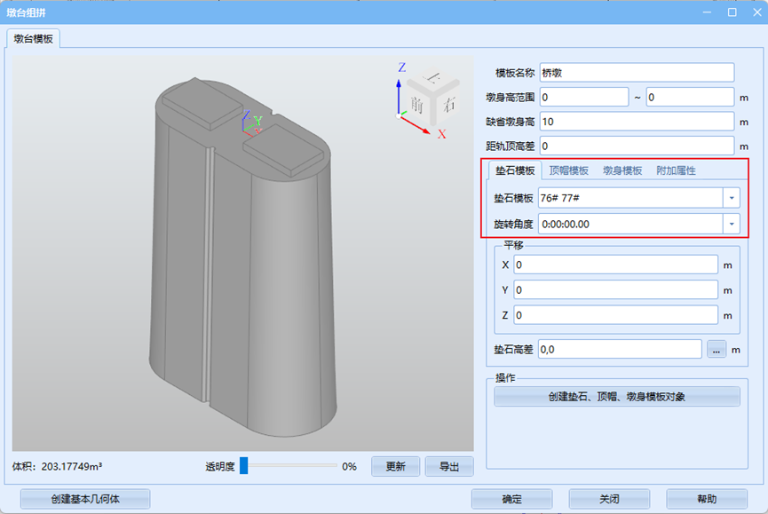 首先在下拉菜单中选择正确的垫石模板、顶帽模板及墩身模板并通过各模板旋转与平移来调整相对位置关系。