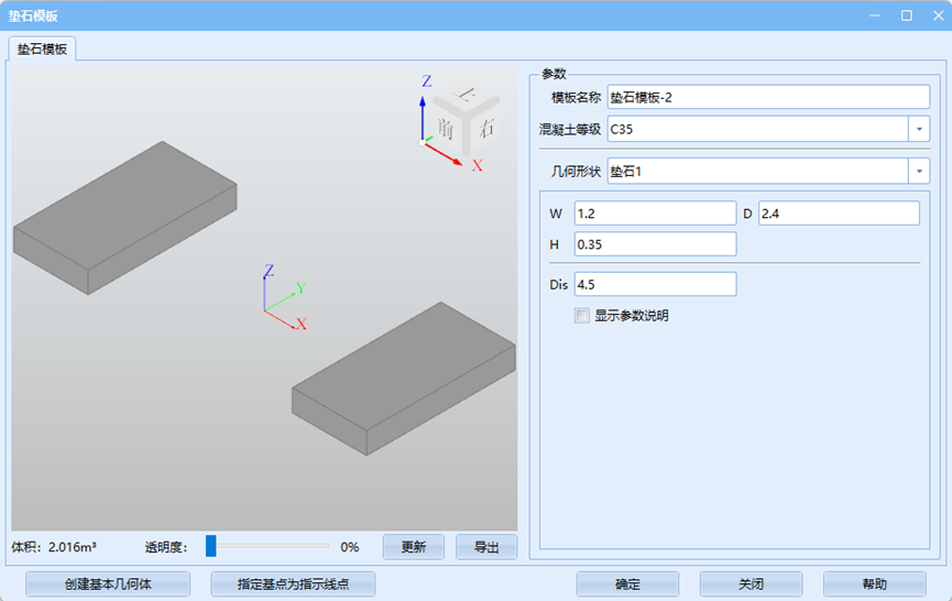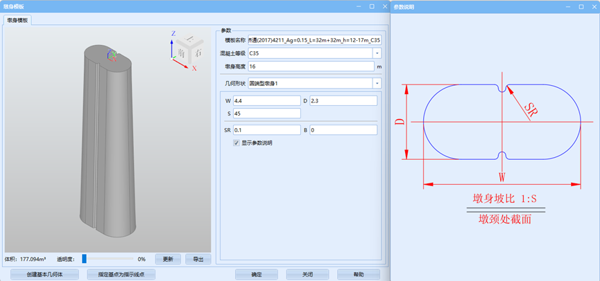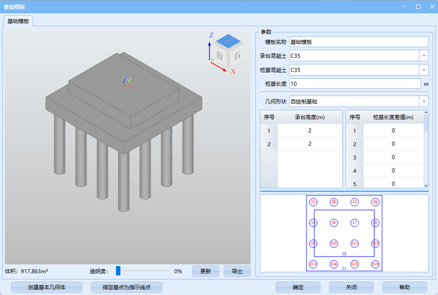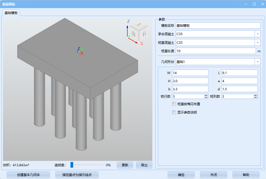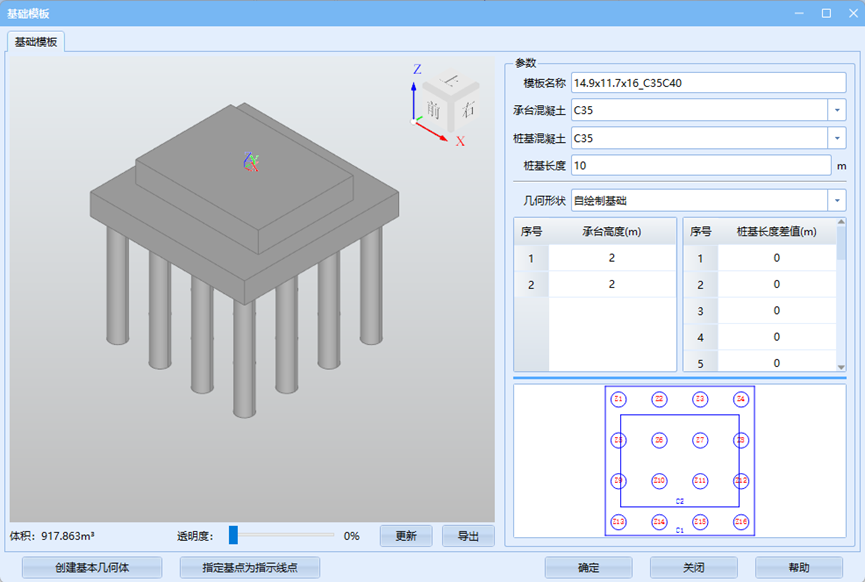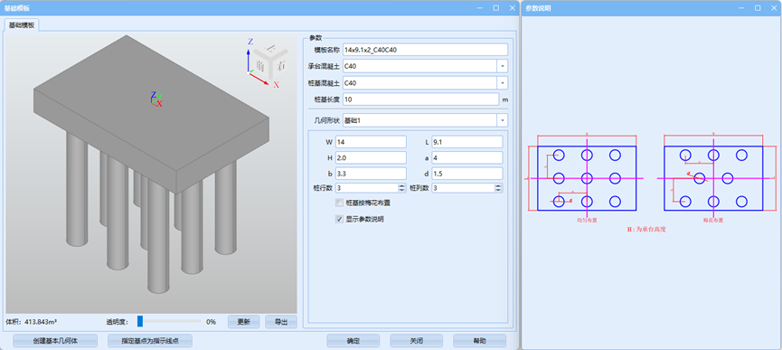 在弹出的对话框中,依次修改模板名称、承台、桩基混凝土标号,其中桩基长度默认即可,后续统一进行修改;勾选显示参数,依照参数说明录入相关参数。