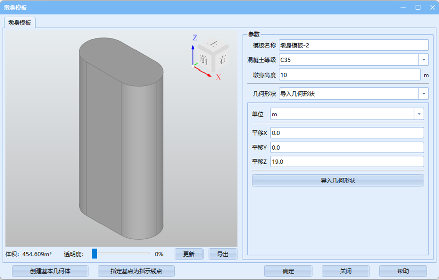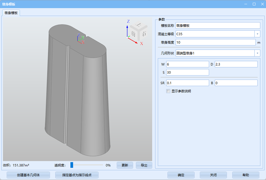 对于导入几何形状墩身模板,该参数无意义,输入0-0即可。 - 缺省墩身高:页面上该墩台模板的显示高度,无实际意义,注意该值需要在墩身高范围内。