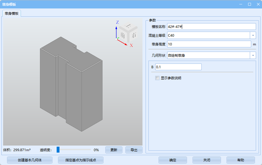 - 墩台模板、基础模板、梁体模板:创建相应模板时给定的名称。