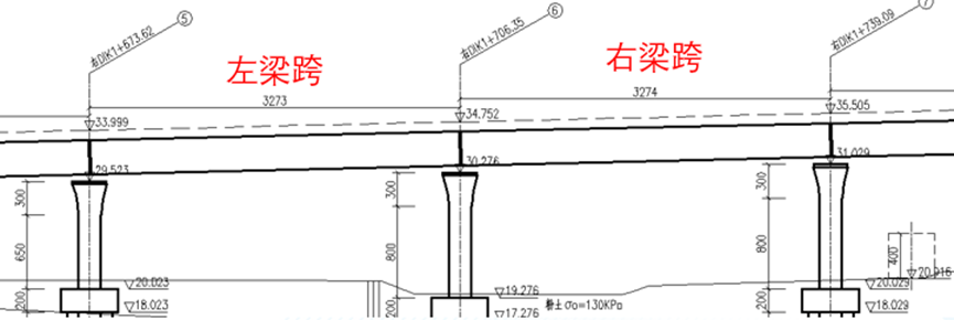 左右梁跨。桥墩所处位置左右梁跨的不同也会导致桥墩尺寸发生变化,常见梁跨组合有32m+32m、32m+24m及24m+24m三种组合,可在全桥布置图中找到。