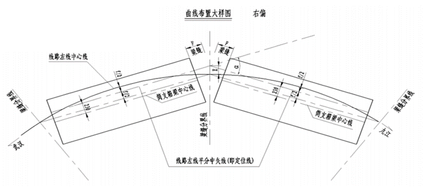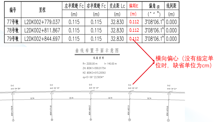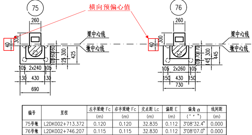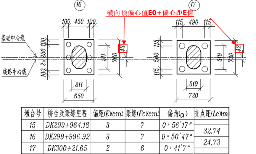 预偏心:因力学上考虑,对于普通铁路桥梁,曲线半径较小时,部分情况下需要将桥墩中心布置在曲线偏心点再外移一水平距离E0,该距离E0称为桥墩的横向预偏心,预偏心在铁路桥梁中并不常见,可在全桥布置图中找到。
