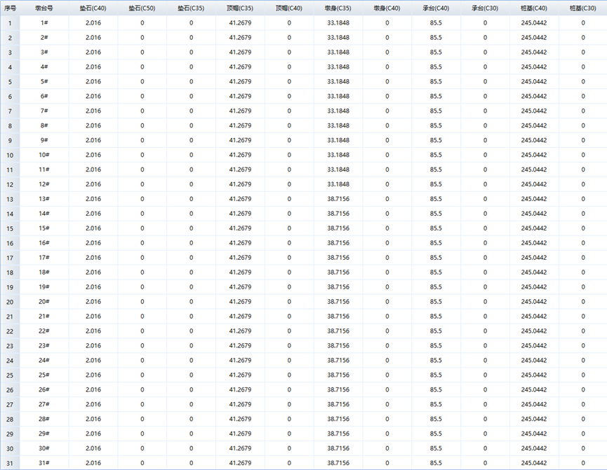 点击查询混凝土方量表按钮,查看混凝土分项与合项数据,还可导出Excel表格。