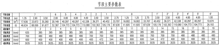 (从上至下依次为立面图、平面图、节段主要参数表及基准截面)