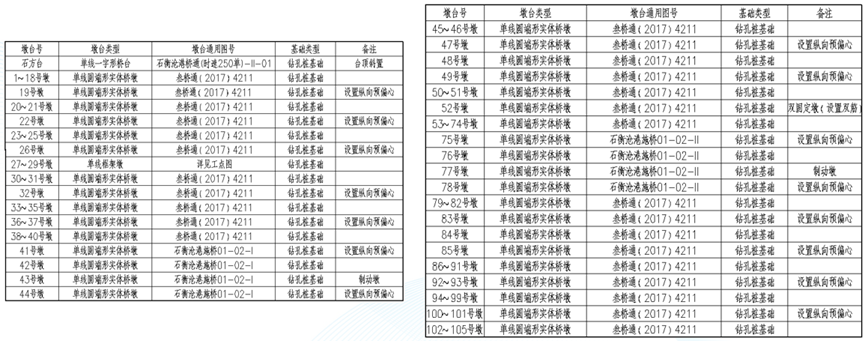 - 墩台类型:有桥台、简支梁桥墩及连续梁主墩三类,其中连续梁边墩属于简支梁桥墩。