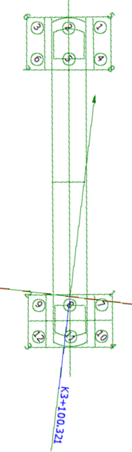 - 采用指示线法定义坐标计算点位,设置桥涵结构物桩号及偏角属性,采用桥涵结构物平面模型的坐标计算及计算机模拟放样方法得到图3所示的点位坐标计算结果及图4所示的计算机模拟放样图。