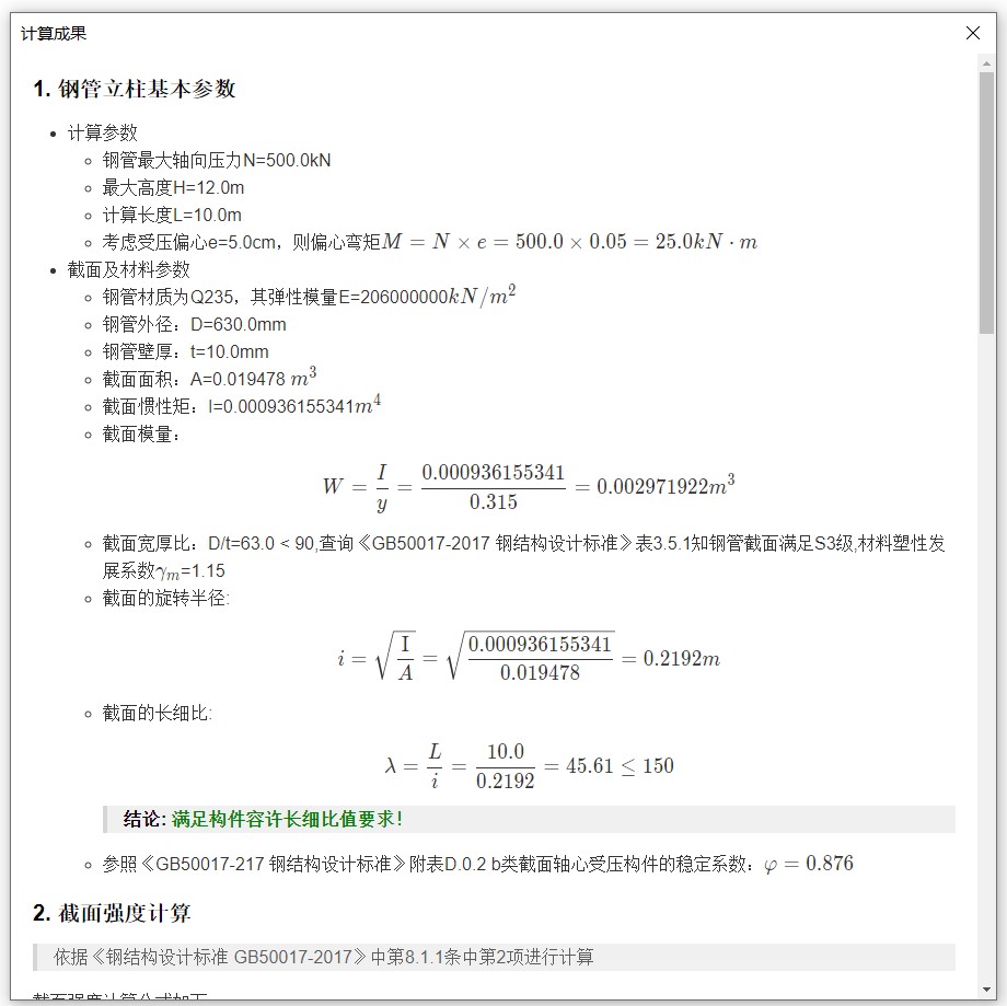 点击窗体上的“强度、稳定性计算”按钮,软件将弹出计算结果窗口,显示钢管立柱的强度和稳定性的计算结果,并以颜色重点标识结果满足或不满足规范要求。