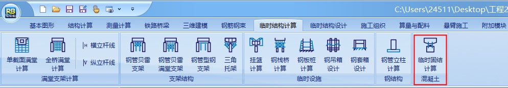 点击 RBCCE 软件的“临时结构计算”页面中“混凝土”面板上的“临时固结计算”,如图: