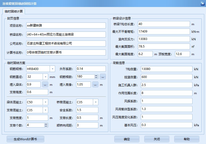 在弹出的窗口中修改封页信息、桥梁设计信息、临时固结方案、荷载信息,再单击“生成 Word 计算书”按钮,即可生成临时固结计算书。