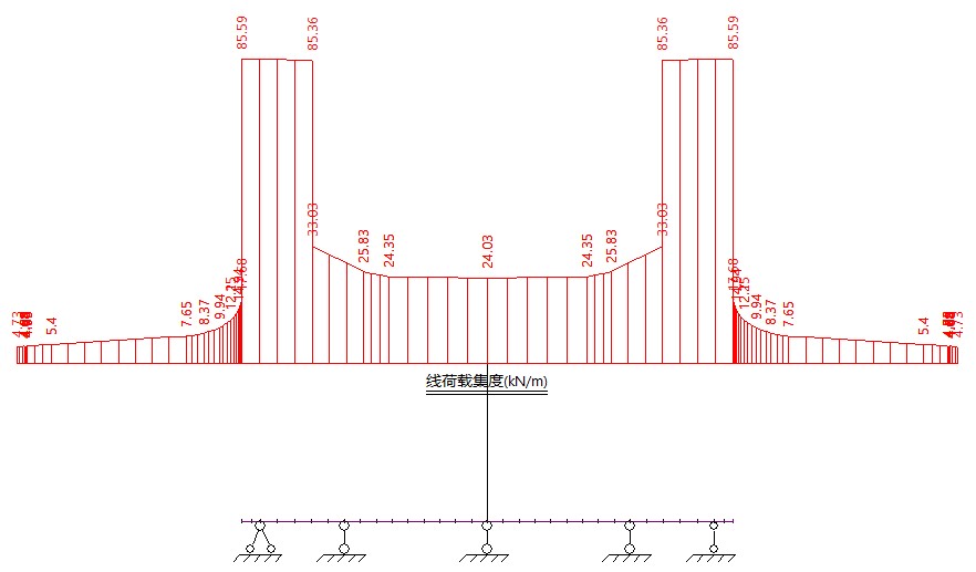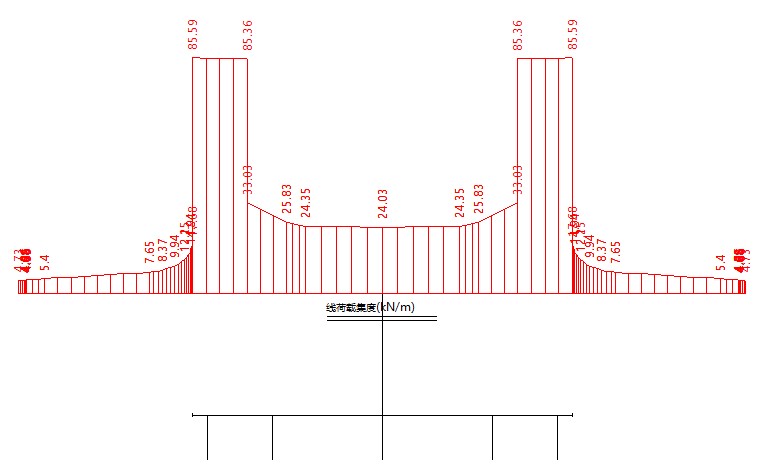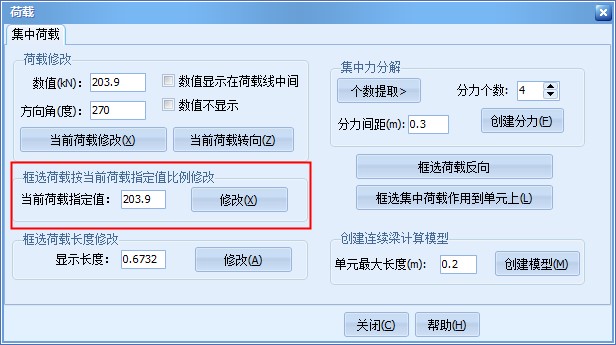 创建大横梁模型,根据承重梁间距布置集中力的位置,根据小横梁支座反力确定集中力的大小比例,框选大横梁计算模型,激活最大的集中力,在“框选荷载按当前荷载指定值比例修改”中输入承重梁支座反力最大值,单击“修改”按钮即可,如图: