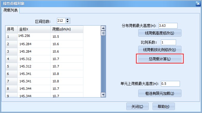 在线性荷载翼缘区绘制两条竖向折线,激活线性荷载,在弹出的线性荷载对象窗口中单击“总荷载计算”按钮,生成翼缘区域的集中力,如图: