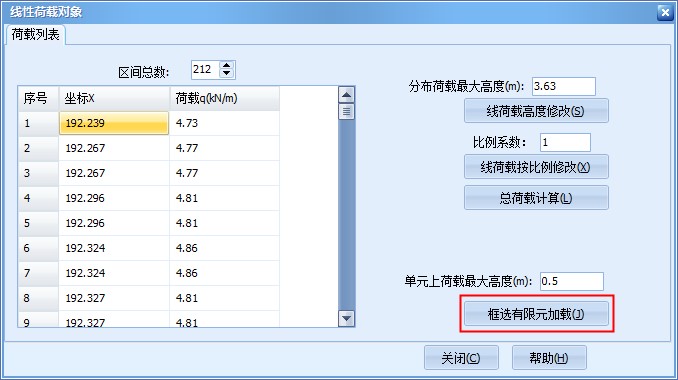 激活线性荷载对象,点击“框选有限元加载”按钮,如图: