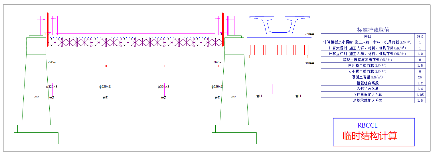 - 激活模式矩形框内“RBCCE临时结构计算”按钮,可创建梁柱式支架横向小分配梁、主承重结构梁和横向大分配梁的有限元模型并查询计算结果