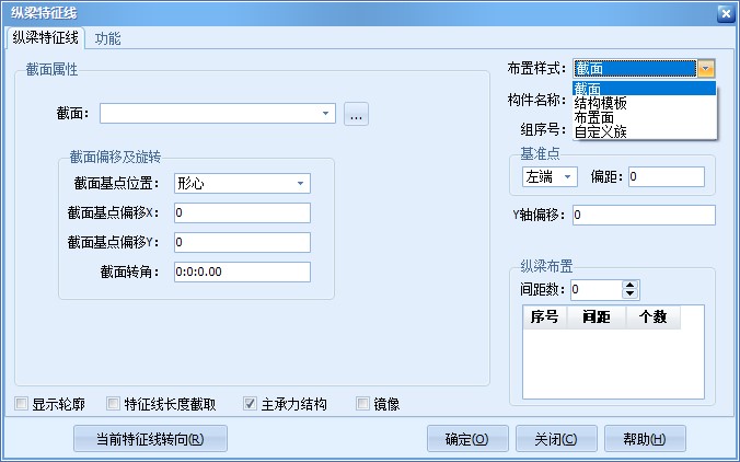 绘制一条折线,根据其属性将其转化为纵梁(横梁)特征线并放置于方案所在位置,激活特征线,弹出纵梁(横梁)特征线窗口,在窗口中可对特征线的布置样式进行选择修改,如图: