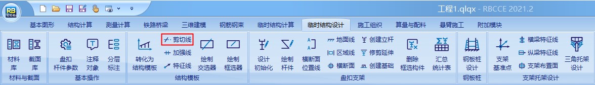 绘制折线,点击 RBCCE 软件的“临时结构设计”页面中“结构模板”面板上的“剪切线”按钮,如图: