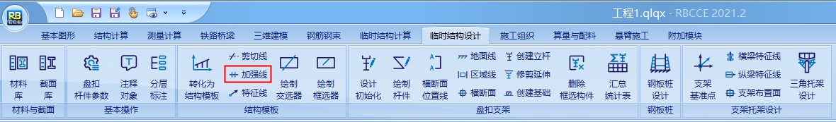 绘制折线,点击 RBCCE 软件的“临时结构设计”页面中“结构模板”面板上的“加强线”按钮,如图:
