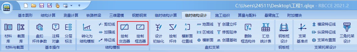 点击 RBCCE 软件的“临时结构设计”页面中“结构模板”面板上的“绘制交选器(框选器)”按钮,如图:
