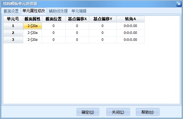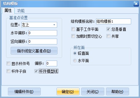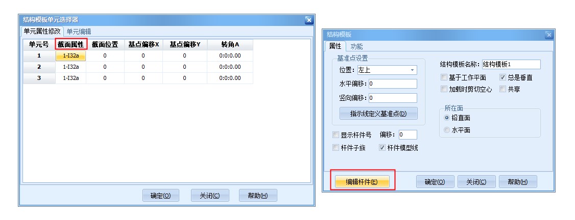 在“结构模板”窗口中可对结构模板基准点位置、名称等进行修改,单击“编辑杆件”按钮可修改结构模板杆件截面属性。
