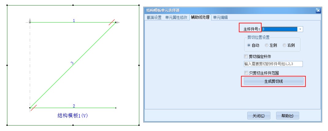 利用单元选择器设置结构模板剪切线:选择杆件号,单击“生成剪切线”按钮对结构模板进行剪切处理。